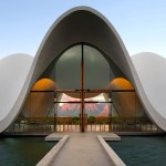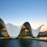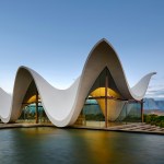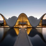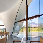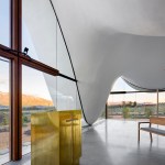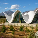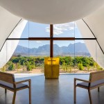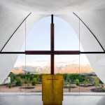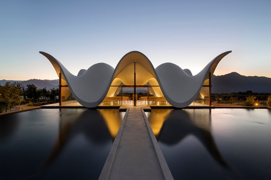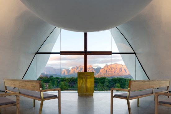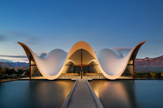 The new chapel, set within a vineyard in South Africa, is designed by South-African born Coetzee Steyn of London based Steyn Studio. Its serene sculptural form emulates the silhouette of surrounding mountain ranges, paying tribute to the historic Cape Dutch gables dotting the rural landscapes of the Western Cape. Constructed from a slim concrete cast shell, the roof supports itself as each undulation dramatically falls to meet the ground. Where each wave of the roof structure rises to a peak, expanses of glazing adjoined centrally by a crucifix adorn the façade.