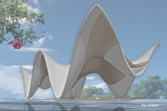 Drawing poetic inspiration from Psalm 36:7, the crisp white form is conceived as a lightweight, and dynamic structure which appears to float within the valley. A reflective pond emphasises the apparent weightlessness of the structure. Elevated upon a plinth, the chapel rises from the flat land its sits upon, providing a hierarchical focal point within its surroundings. New planting including a vineyard and pomegranate orchard create a lush green oasis on the otherwise exposed site.