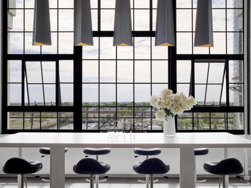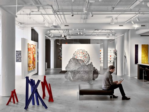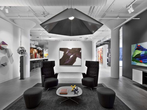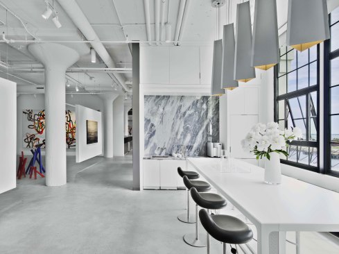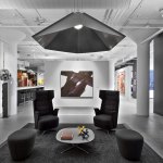 Artwork takes center stage in the new home for Boston Art, a consulting firm specializing in providing art programs for a wide variety of clients. Occupying 6,750 sf in the Innovation and Design Building in Boston’s Seaport District, the space includes a workplace, showroom, and creative laboratory in which clients can curate their collections alongside staff. The design is airy, calm, and sophisticated, celebrating the industrial qualities of the 1918 warehouse. At the heart of the space is an open gallery with suspended moveable walls. The open layout benefits from daylight and views from large windows overlooking the harbor.
