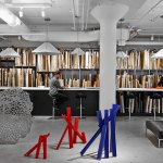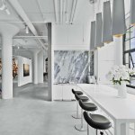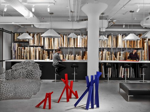 Boston Art’s new workspace turns the white-cube metaphor upside down, bringing the back-of-house experience front and center and making it more accessible for clients, who have the sense that they have entered a design studio where they can take part in the creative process. Emphasizing this sense of openness, glass walls and a frameless glass front door allow an unobstructed view through the reception area deep into the new workspace.