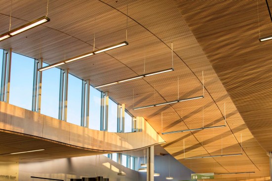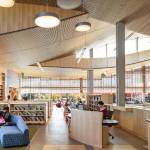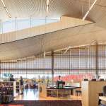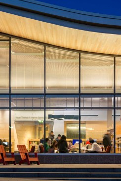Capping the library is an undulating roof that admits ample daylight to fill wood-wrapped common areas. The roof provides an iconic form that anchors the end of the park, and the west-facing glass curtainwall lets passersby look into the warm, inviting interior.
