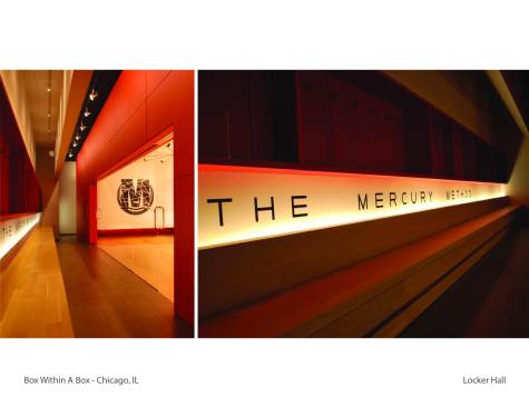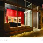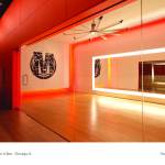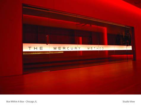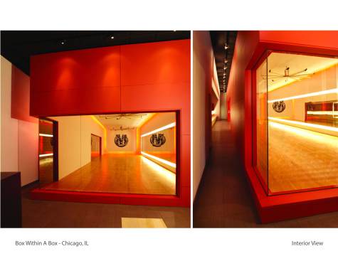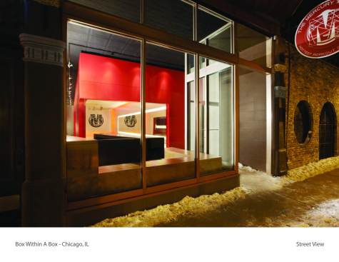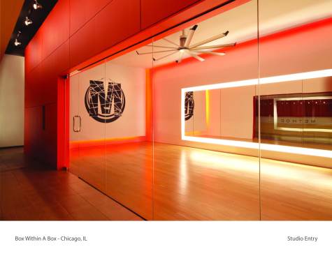 Located in an existing storefront space in a vintage Bucktown building, this is our San Francisco based client’s Chicago flagship workout studio. The program included a main workout room to be enclosed and kept at a very warm 98.6 degrees (same temperature as the human body), changing rooms, reception desk, shoe storage, open lockers, and benches where patrons can remove their shoes before entering the workout room. By clearly defining its mass and volume, we celebrate the main workout room, affectionately known as the "hot box" and define it as a distinct and featured element. As seen from the street, this red panel clad workout room visually reads as a box within a box and becomes the calling card feature of the workout studio. Selectively carved openings in the walls of the box create views in and out, and to allow the interior architecture to dramatically reveal itself as one follows the path of circulation.