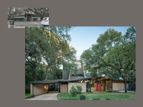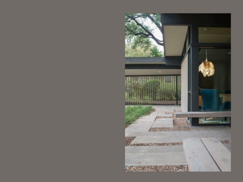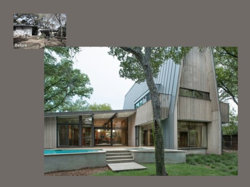 The A-frame opens up at the roof to incorporate a roof deck with city views, and the vertical wood shading device at its ends mitigates the harsh morning and afternoon sun. Continuous epoxy-pebble flooring blurs the line between inside and out, and a bright orange laminate countertop reintroduces materiality from the home’s original era.