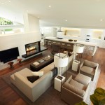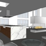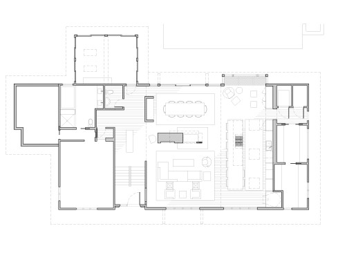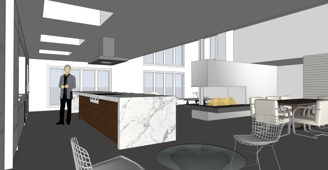 Tucked away in a quiet cul-de-sac in an established suburban neighborhood, this mid-century rambler has been infused with a fresh new spirit and a contemporary design sensibility. The designers collaborated with the homeowners to transform a series of dark, outdated, and badly connected rooms into an expansive, light-filled space for cooking, dining, entertaining, and relaxing. Designed to capture the natural light as it travels across the house, the new spaces center around a dramatic, cantilevered open fireplace finished with Venetian plaster, and a floating hearth and bench made from gun-blued steel. At the heart of this very modern home, the kitchen features custom white lacquered cabinets, an integrated wood-fired pizza oven and a stunning 4 ft. x 21 ft. center island carved from Calacatta Michelangelo marble, while a new wall of windows offer views of the beautiful outdoor pool area.