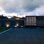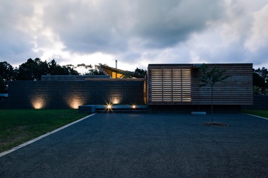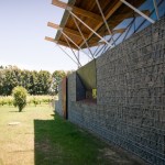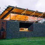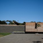 The gabion basket walls start low demarcating entry points and rise up to form the anchor wall of the house.