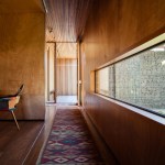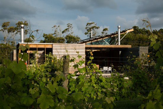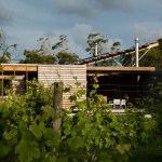 The house is elevated on a blockwork plinth to lift it out of the potentially soggy homogeneous land. This height allows the boxes to float, gives the occupants a view over the vineyards and brings them closer to the eye height of the horseman. The plinth, intersected and edged by the gabions serves to blind the positive and negative spaces
