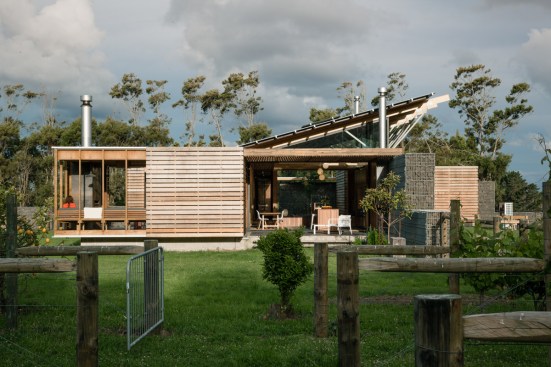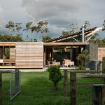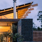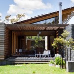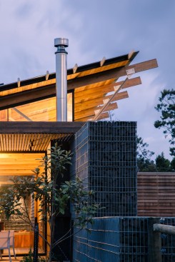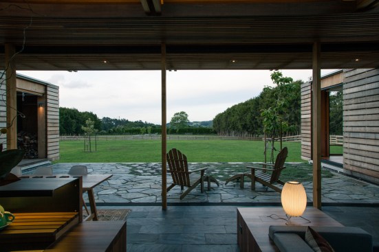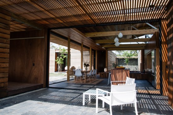 The house has 3 positive elements with negative spaces between. These positive elements house the Lania, the garage and the bedrooms. They are articulated as simple box forms with weathered timber planked skins referencing agrarian crates. The giant crates form the edges to the negative spaces and frame views of the site.