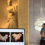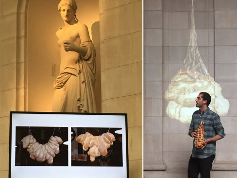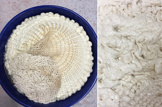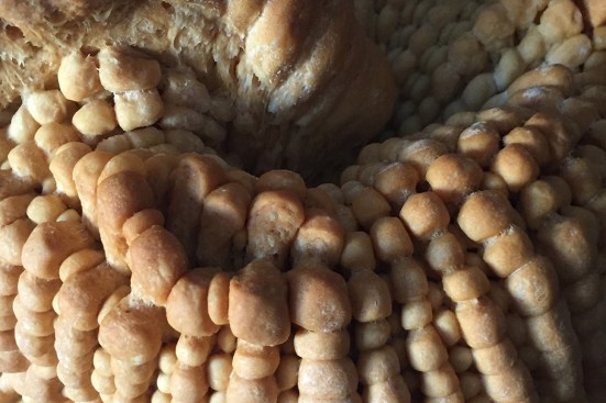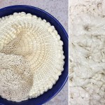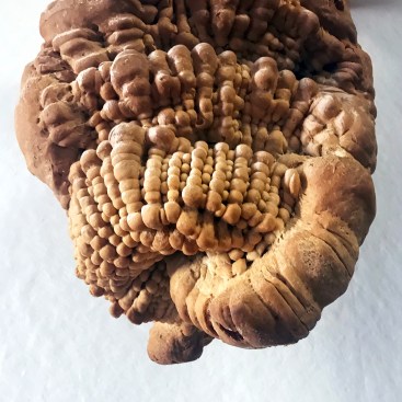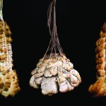 Bread Bondage is a design experiment that explores relationships between architecture and food and unpacks the processes related to material behavior, state transformation, tactility of form, the grotesque and the pleasure of consumption. The study explores an indeterminate set of net‐casting procedures that are typically related to the formation of architectural objects but, through the use of a very atypical material, alive with yeast and manipulatable by heat and practices of kneading, expands the results into the realm of sensorial pleasure and literal human consumption. In the dough net casting process, the multiple ingredients are used to increase the surface area of the crust and voluptuous tactility of the object. ‘Bread Bondage’ attempts to visualize sets of overlaid physical and state‐change behaviors while exploring potential for tactile and spatial architectural effects: the dough is pushed by its own weight and expansive forces from the string net, slumping and folding over multiple waistlines, suspending the volume to allow for force based resolutions and application of heat. The objects in ‘Bread Bondage’ want to be teased, caressed and eaten in chunks, collectively or alone, leaving a trace of their past in the remaining carcasses, which develop identities of their own as remnants of the consumed.