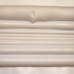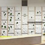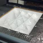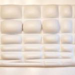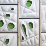 HouMinn’s efforts culminated in the VarVac Wall, an ornamental, acoustically absorptive wall installed at the University of Minnesota School of Architecture, where Swackhamer is an associate professor and director of the M.Arch. program. The white plastic panels have an undulating, non-repeating topography of mounds and bubbles, some of which are sliced to expose the underlying green, acoustical fabric.