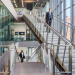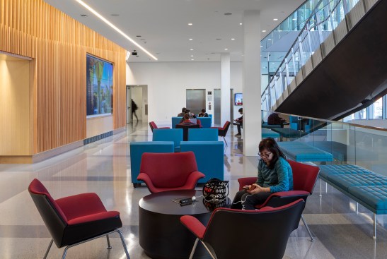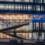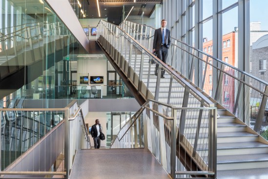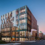 Located in Collegetown section of Ithaca, New York, one block off campus from Cornell University, the Center for Business Education is a seven-story, 76,000-square-foot, twenty-first century teaching and learning environment. Interactive classrooms are supported by breakout rooms, faculty and student offices, as well as commons and social spaces. The building accommodates two 90-seat tiered classrooms, two 75-seat tiered classrooms, a divisible, flat-floor classroom for 120 students, and commons and event spaces on the first three floors and a spatially-connected lower level. The Center’s top three floors provide enclosed offices for faculty and administrators, open office work stations, conference rooms and team rooms, and two broadcasting and recording studios. The Center was located off campus to sponsor development and rejuvenate the downtown. Since its opening, adjacent residential and retail projects have been constructed. The Center for Business Education contrasts within its urban context to establish a strong identity and academic center in this commercial zone. The building façade is a combination of clear and patterned glass with a rhythmic arrangement of angled and straight projecting mullion-fins, colored compatibly with the brick of its neighbors. The transparency of the ground floor and the learning commons highlighted by an undulating feature wall of wood slats and video screens embraces the adjacent street. The variegated patterns on the facades serve to reduce its scale, and the setback upper floors along the street are rendered in dark metal to differentiate upper from lower and facilitate a relationship with the smaller scale of adjacent buildings.