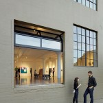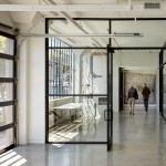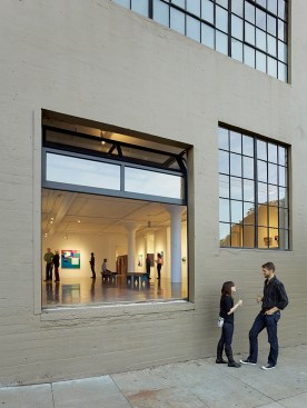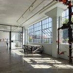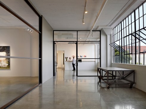 Designed to maximize natural light and flexibility for exhibitions, the gallery and public spaces have ample circulation and service facilities for public events. New glass walls divide the respective galleries from the shared lobby, while glass garage doors replace steel roll-up doors for light and air at the same time retaining the function of receiving. Consolidated to the ceiling, electrical and mechanical services have been exposed in keeping with the concrete mushroom columns. Finally, an old, industrial, steel, sliding door, once made in the building – now rescued, hangs in a place of honor on the wall at the entrance to the lobby.