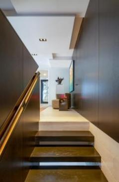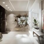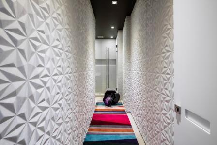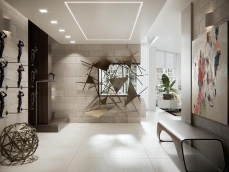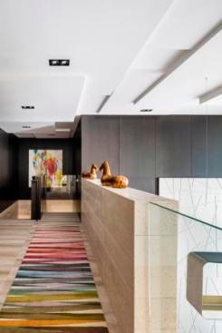 The original layout of the space featured a floating staircase in the middle of the foyer/living area, interrupting the flow of the living space. Ceilings were low due to an outdated A/C system. EOLO used the residual areas between bathrooms to encase the new stairway, complete with stone-integrated Ann Sacks sconces, creating a large foyer that organized the circulation on the first floor. The new foyer also serves to display part of the clients’ art collection.