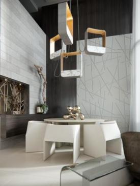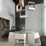 While the kitchen serves as a heart of the home, materials were chosen to lend richness and texture throughout the space, defining proportions and ratios, with an emphasis on clean, compelling lines to embody a “Modern Eclectic Contemporary” feel. Oversized artwork; furniture from Patricia Urquiola, Poltrona Frau, Luminaire, and Jader Almeida; rugs from the Rug Company; and a custom geometric lighting fixture in the dining area emphasize proportion in the two-story space, while maximizing the space’s relationship to the double-height view.