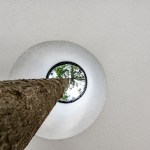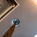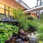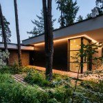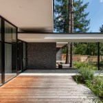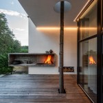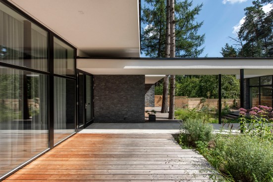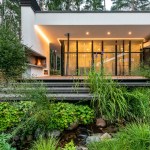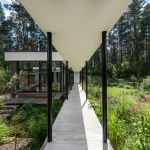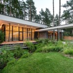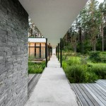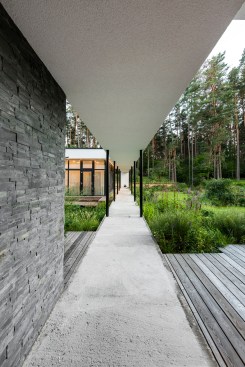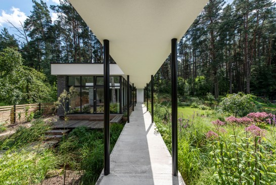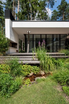 Expressive modern style house is designed in a lot surrounded by nature. Pine forests are on two sides of the lot. It was clients desire to find such an oasis in nature with a small river or creek, what became a specific task for Architects, because the flowing water divided land into two parts. The challenge was to incorporate the new house into existing nature as much as possible. Design and concept consists of two main volumes: home of the owners and a small house for guests. These two parts are connected with an open bridge, which becomes the axis of assembly and face of the house. Existing trees were also involved into design, they are passing through the roof of building. Large windows connects the interior and exterior spaces, what creates a cozy and calm atmosphere for residents and their guests. Much attention has been devoted to supplement the design with subtle landscaping, open fireplace and wooden terraces, where you can relax listening to the sound of water, enjoy wonderful view. In final result modern lines of white house are even more prominent with green natural environment.