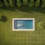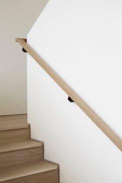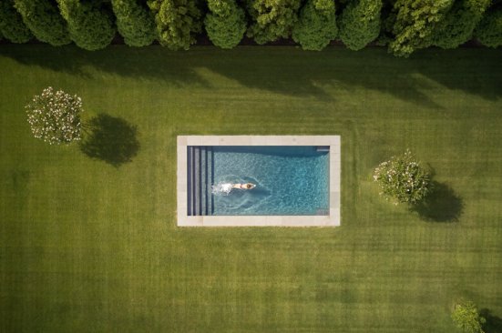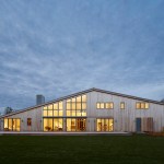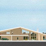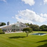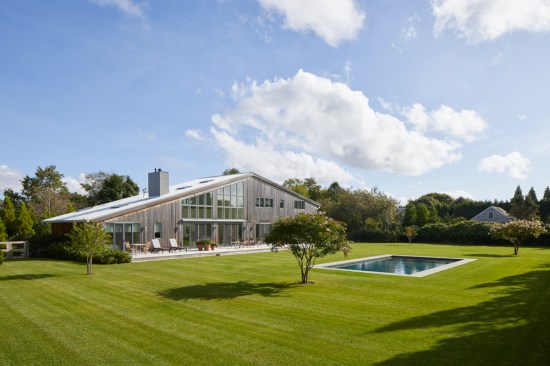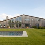 Set on a grassy stretch of landscape outside Bridgehampton, NY, this house was designed as a contemporary interpretation of the region’s vernacular architecture, customized to our client’s aspirations for the property. The building’s distinctive form references the saltbox, a traditional pitched-roof architectural style prevalent throughout Long Island’s Eastern End. The house is oriented so the long axes face north and south, with custom windows on the southern side that follow the roofline, providing ample natural light throughout the day. Sliding doors open onto a wide deck and face a pool proportioned to match the house. The building’s rectangular shape provides a cost-effective approach to design, allowing for an efficient construction and interior layout. Clad in a knotty cedar, the building will become grayer over time. Designed for environmental efficiency and to promote wellness, the house uses natural materials, including reclaimed pine planks. The house’s overall shape not only gives it a distinctive presence, it also helps it to endure the extreme weather conditions of Eastern Long Island.