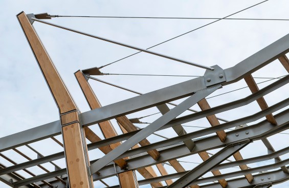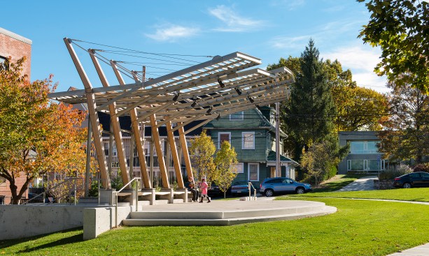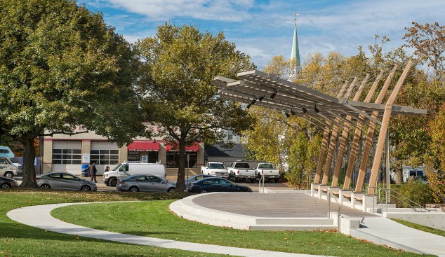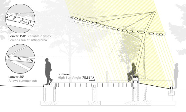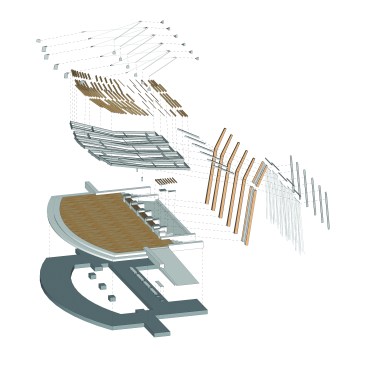 An outdoor Performing Theater set within Brighton Commons Park, designed for the surrounding communities use. From the outset the park and new theater pavilion were to be used as a catalyst to transform an under-utilized public space by providing an armature for public events and performances. The form and detailing are derived from the rich rail yard history of the surrounding Brighton area. The pavilion’s form captures the act of converging and diverging railroad tracks, while creating a space that opens out to the park. The Pavilion canopy binds the rhythmic structure to the motion of the locomotive and train tracks, by varying louver angles to provide shade for the users and light for climbing vines.