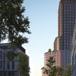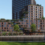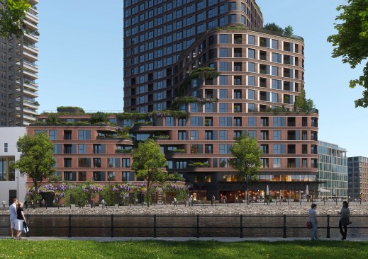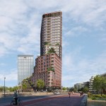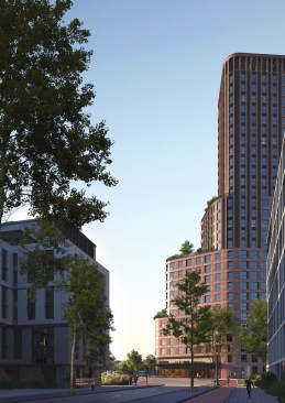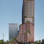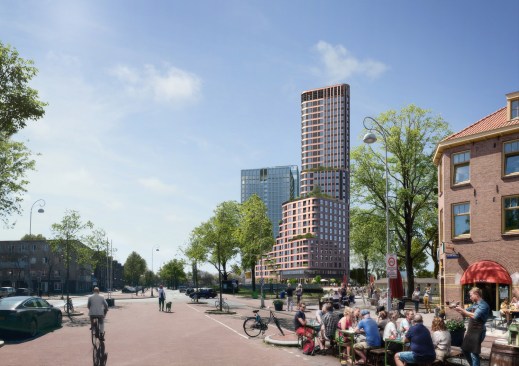 The 28-storey tower accommodates a mixed program with a commercial plinth, social housing and much desired medium-priced rental housing including 406 apartments of which 266 rental homes in the middle segment, 120 at affordable rent, a residential care facility, built-in community facilities, a community centre and commercial facilities such as a bowling and cafe. The lively plinth with catering and local entrepreneurs will become the meeting point of the neighbourhood.The tower is stepped with elegant rounded corners and reaches up to 90 meters high. The side facing Van der Pek neighbourhood has a slender shape with a cascade of green, collective roof terraces and gardens where residents can meet. On the other side, the tower is wider, just like the robust adjacent towers of Overhoeks.