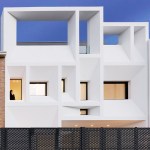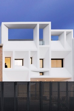 Housing located in a residential area near Valencia. It is a project in section (and in elevation), that provides an interesting game of different interior heights, communicated by a light and sculptural staircase of steel and oak that articulates the house. On the outside, the variety of heights moves to the elevation, where the geometric sincerity gives rise to a powerful Brise Soleil that opens the house to the long views of the west, while it protects of the solar radiation. Light and shadow controlled from the outside to the interior.