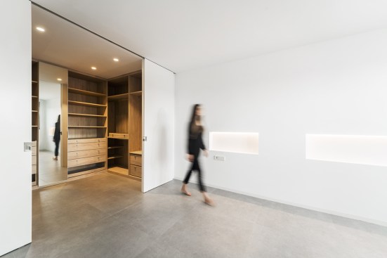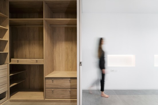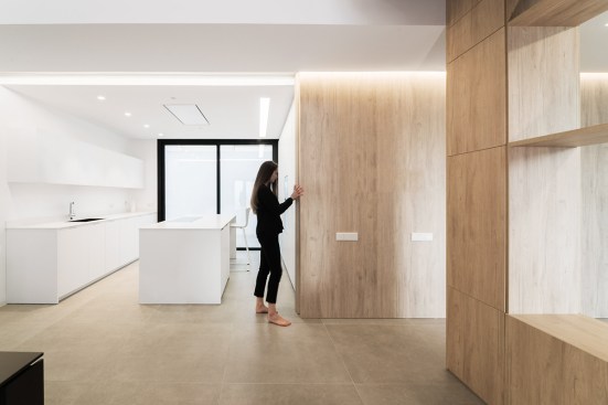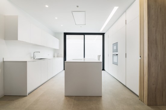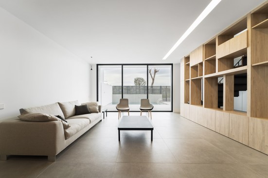 The day zone, is developed as an open space around a staircase and central furniture completely permeable. The concealable sliding door systems, aluminum and glass in the exterior, and wood indoors, allow a total use of the plot in the longitudinal direction, being linked from pool to the interior courtyard.