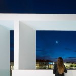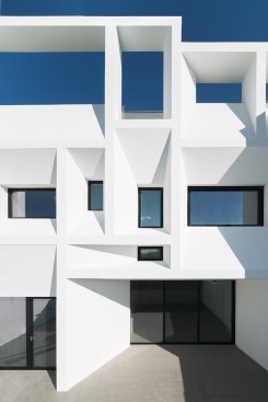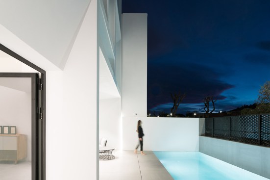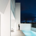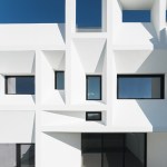 From the street, the black deployé, gives the necessary privacy to the outside pool area, while in contrast cuts the superior look towards the white Brise Soleil of the main elevation, facing south-west. The facade is folded in trapezoidal inclined planes, which with a total depth of one meter, generate the necessary shadow over the large glazed hollows, apparently random, but which respond in size, shape and position to the requirement of each interior space they serve. Pure and subtle geometry at the service of the interior needs.