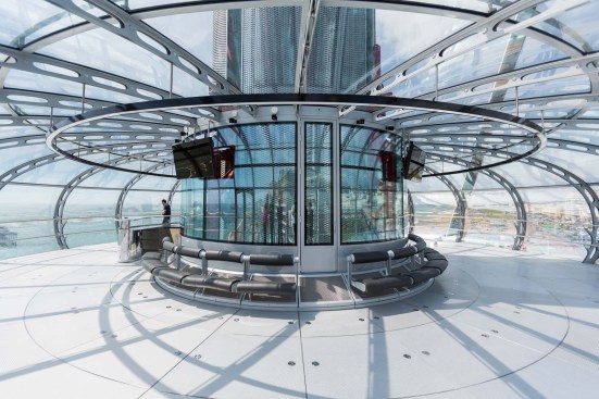 Passengers on British Airways i360 will board a specially designed pod, ten times the size of a London Eye capsule, capable of holding up to 200 people comfortably. Passengers can walk around freely inside the pod. Seating is provided and the interior environment of the pod is controlled to ensure passengers are comfortable. There is always a pod host on board who is in touch with the ground via camera and radio links. The double-glazing of the pod ensures that the views are magnificent and, because the pod ascends on the outside of the tower, the views are totally unobstructed. The pod is 18 metres in diameter and weighs 94 tonnes.