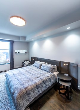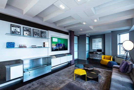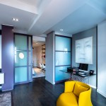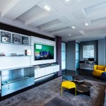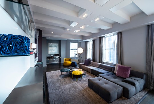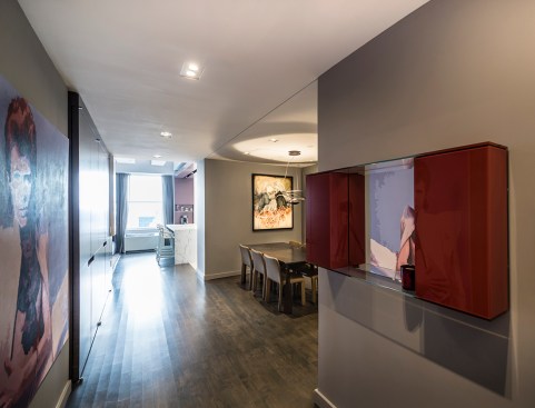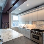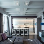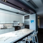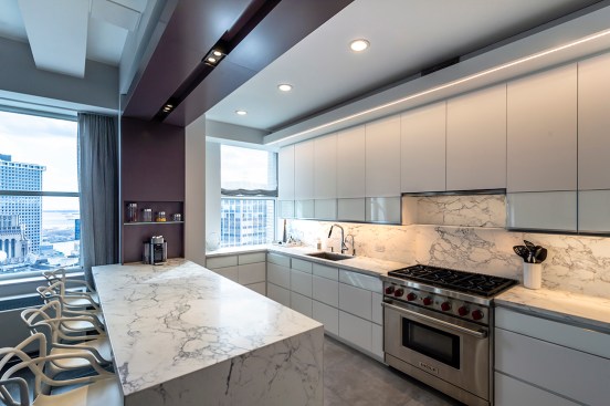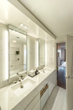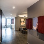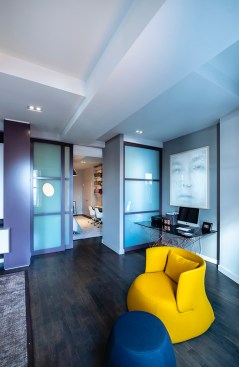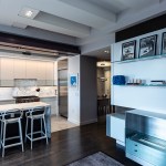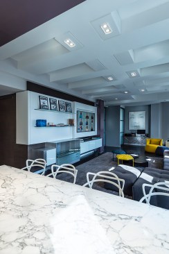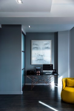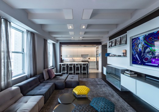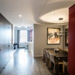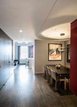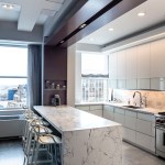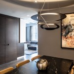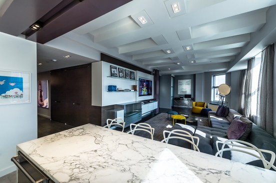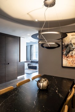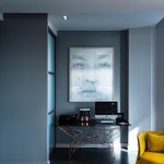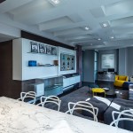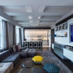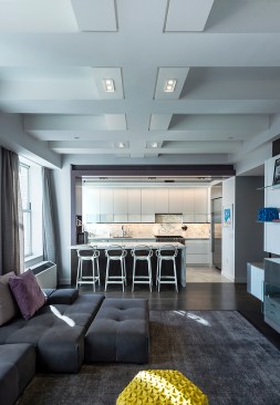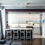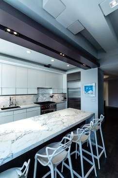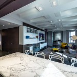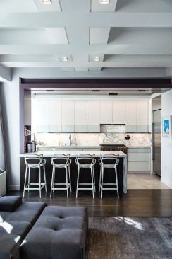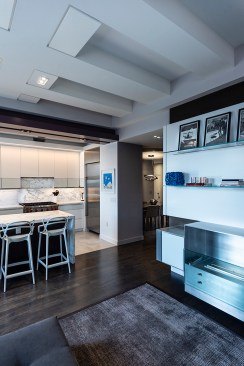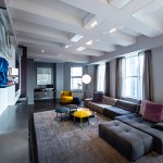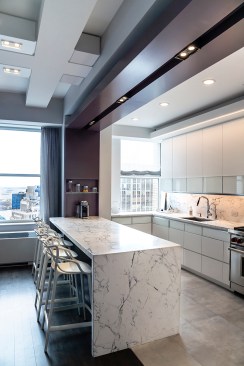 This new Wall Street apartment epitomizes loft living as the new modern interior is carefully designed to fit within the more industrial aesthetic of the existing building’s structure. The industrial roots of the space were retained to allow for expansive beams and high ceilings to accentuate the living spaces below. Bold accents of white marble and backpainted glass brighten the interior, while warmer hues of grey lacquer and hints of wood create a welcome feeling of warmth for the home.