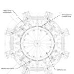 To ensure optimal execution of the colonnade’s construction, the firm consulted with Fred Langford, an architect who worked in Louis Kahn’s studio on both the Government Center at Dhaka in Bangladesh and the Salk Institute in La Jolla, Calif. Langford returned with detailed working drawings and provided KieranTimberlake and Baker Concrete Construction with instructions on how to build the formwork (one of Langford’s proposed formwork diagrams is shown at left) and place the concrete. After testing multiple mockups, six custom millwork forms were made, with each used three times to cast the 18 columns on site. Standing approximately 17 feet tall, each column has 32 facets and narrows subtly in diameter from 32 inches at the top to 28 inches at grade level.