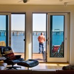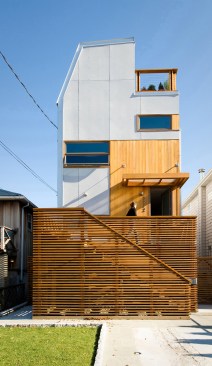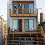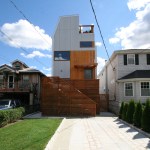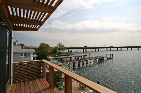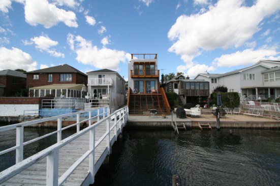 This urban infill prefab home is located at the foot of the Throgs Neck Bridge on Eastchester Bay in the Bronx. The Bronx Box is a modified version of the double-decker, two-story bar typology within the Modern Modular system developed by RESOLUTION: 4 ARCHITECTURE with an additional storage ‘saddle bag’, containing built-in cabinets along the length of the house. Given the narrow lot, the design aims to celebrate the constraints of its zoning envelope; the site’s set backs, height limitations, and flood plain requirements yield a compact footprint while still featuring off-street parking, a small patch of green space, and an expansive roof deck with stunning views of the bay beyond. The first floor is compact and contains a wall of storage running the length of the floor. An open living, dining and kitchen area is organized in a linear manner and opens out onto an elevated deck. Exterior stairs are the full width of the house and lead down to the pier that juts out into the bay. The second floor mimics the linear organization of the first with a wall of storage as well, but two bedrooms and two bathrooms occupy the rest of the space. The master bedroom features its own fireplace and balcony while a structural glass skylight allows for natural light into the internal bathroom. A metal-clad roof bulkhead was carefully sculpted within the zoning restrictions and provides access to an expansive roof deck providing 360-degree views of the bay and surrounding neighborhood. The house is clad in low-maintenance, durable cement board with cedar accents and Ipe wood decking. Given that the home’s modern aesthetic builds from the existing colors, textures, and diverse qualities within the surrounding urban context, it has been accepted as another unique personality within the neighborhood.
