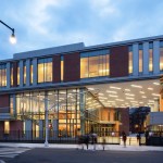 The building’s façade is inspired by the traditional use of brick on campus but employed in a contemporary manner. The alternating brick-and-metal panels, combined with a transparent curtainwall, gives an almost playful rhythm to the building’s exterior while providing glimpses to the vibrancy of the activities within. During the evening, the golden color of the interior walls creates a warm glow along the street.