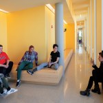 In the exterior space previously formed by Gershwin and Whitman Halls what was once a seldom used, asphalt amphitheater is now a lush courtyard planted with a wide variety of native plants. A circular arc of special paving material is dotted with chairs and seating areas, establishing a destination and informal gathering space for this formerly unused area of the campus.
