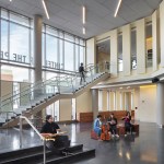 A dramatic, two-story lobby serves as the entrance to the Center and an informal gathering space. The grand stair to the upper level and the balcony offer ample opportunities for students to “see and be seen.” While the programmatic focus of the building is performance, instruction, rehearsal and practice spaces, sitting nooks, overlooks and expansive views support student life, providing a variety of spaces where students and faculty can interact.