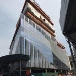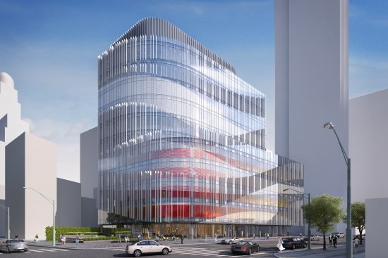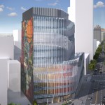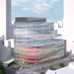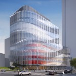 These urban moves are further reinforced through the dematerialization of the building wall. The building has a highly transparent curtain wall with a wave pattern of frit, applied to the inside surface of the glass, and projecting metal fins that render the position of the wall itself ambiguous with regard to the surrounding buildings. An artistic mural will be applied to the south wall.