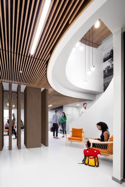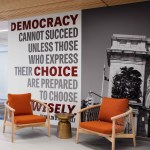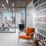 The recently-completed expansion in an adjacent building on Livingston Street includes a variety of instructional spaces, administrative areas, and student work spaces on two floors connected by an inner stair. The new location consolidates and exposes efficiencies by housing student services and other collaborative workspaces while maintaining a collegiate environment within an office building.
