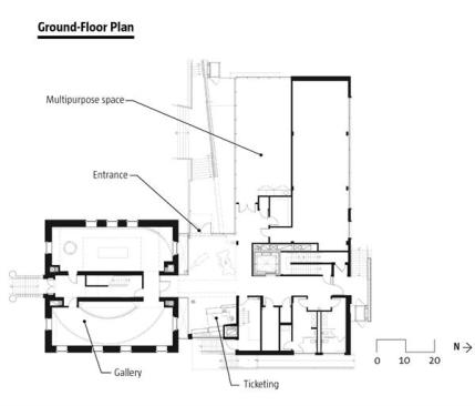 While most of the historic building is designated for gallery space with exhibits touting the history of the site, the addition to the north adds meeting and education areas, as well as leasable office space to bring more businesses to the Yard. The new wing also features a rooftop café, terrace, and green roof. The glass-and-steel structure injects a distinctly modern aesthetic into the historic property. “We wanted a contrast between old and new,” notes Workshop/apd partner Matthew Berman, Assoc. AIA.