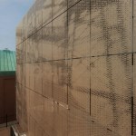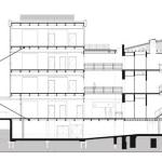 The architects clad the addition’s north and east elevations in corrugated metal, tying it into the site’s industrial vernacular. On the south, a glass curtainwall shrouded by a perforated metal screen offers views to a forecourt designed by Julie Bargmann of D.I.R.T. Studio and to the city beyond. The screen provides a defense against solar gain (the architects are targeting the project for LEED Platinum certification), but the laser-cut perforation pattern, derived from an abstracted 1936 photograph of the U.S.S. Brooklyn, also offers a contemporary response to the original building’s historic ornamentation. “We wanted the new building to act in deference to the historic one,” Berman says. “The metal screen is almost like a theater curtain, pulling back to reveal the old Commandant’s house.”