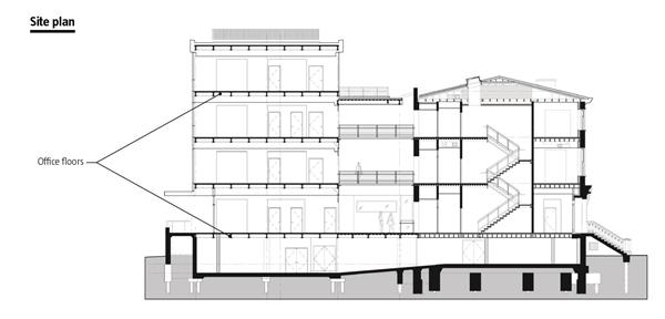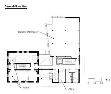 Appropriate to the site’s changing identity, the Brooklyn Navy Yard Center, designed by New York firms Workshop/apd and Beyer Blinder Belle, combines old and new: The restored 9,500-square-foot Building 92, built in 1857 and used as the Marine Commandant’s House, is connected to a new 24,500-square-foot addition by a three-story lobby. Like so many other Navy Yard facilities, Building 92 had fallen into extreme disrepair. “There were holes through the floors, holes in the walls, and the entire southeast corner had settled,” says Elizabeth Leber, AIA, a partner at Beyer Blinder Belle. “It was really just a shell.” In an effort to resuscitate the brick-and-wood joist structure, the architects inserted drilled displacement piles and grade beams to give the building a stable foundation, and stainless steel helical ties and grout injection helped shore up the shell. Working from historical documents, the architects preserved as many original architectural details as possible.