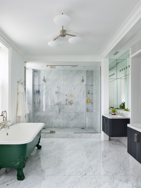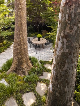 In the rear, a glass and steel addition was carefully cantilevered and stepped around two mature London plane trees to protect tree roots and to project the kitchen and dining area into the garden. This new space—which inhabits the zone between interior and exterior– is reached from the parlor floor by a bridge. The resulting rear facade unifies the neighboring rear additions, while providing floor to ceiling glass to bring southern light and garden views deep into the house.