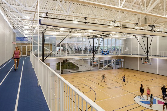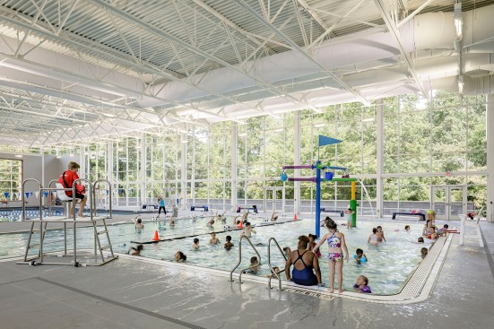 Carefully sited to preserve existing Park fields and recreation areas, the YMCA is built into a slope, lowering the perceived massing of the entry and nestling the building next to mature woods for expansive views to nature. Generous windows, expansive daylighting, and transparent details contribute to a sense of openness and communion with the surrounding natural beauty.