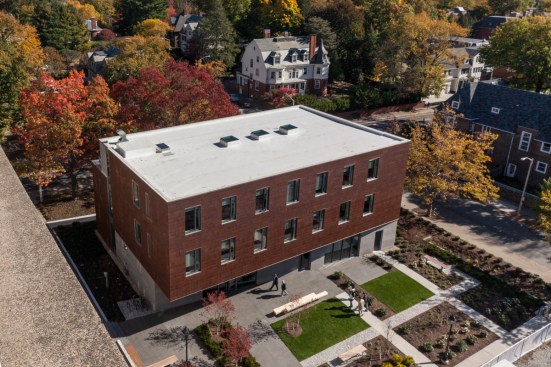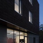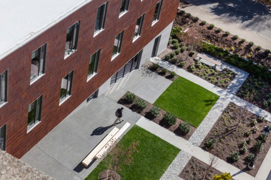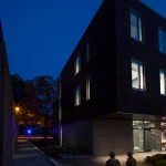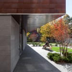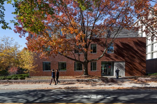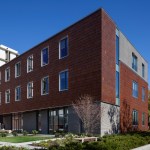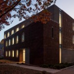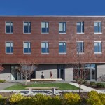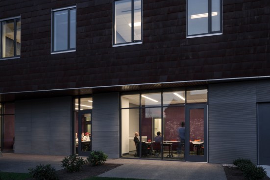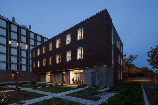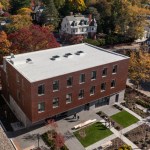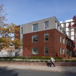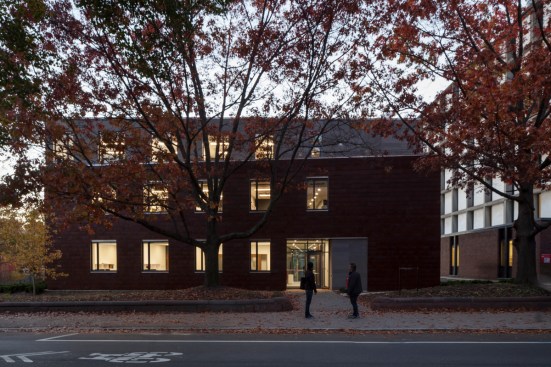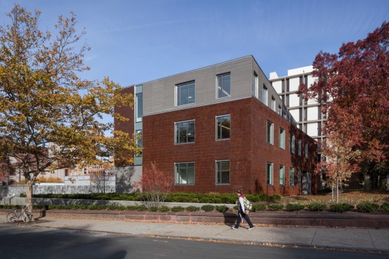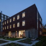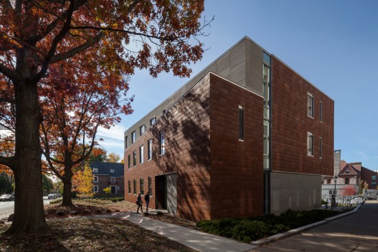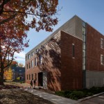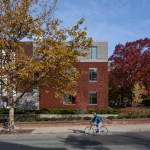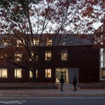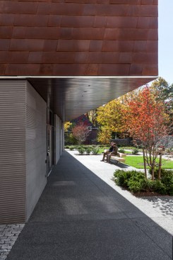 This project for Brown University expands the home of the Division of Applied Mathematics to a prominent corner site on historic Hope Street. The building design mediates between the institutional scale of the campus and the residential scale of the street in its massing, material and detailing. The site strategy creates a campus lawn and a series of garden rooms between its site and 182 George Street, a historic, Richardson Romanesque home also occupied by Applied Math. Weathered steel shingles and fluted cast stone panels define the volume, with glazed openings scaled to the campus and the street.