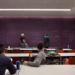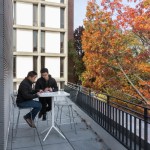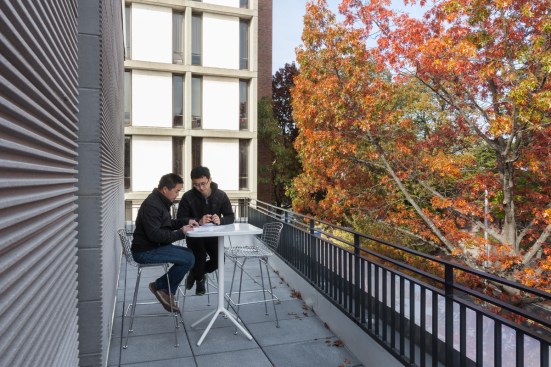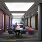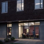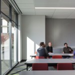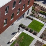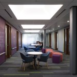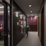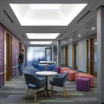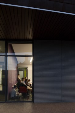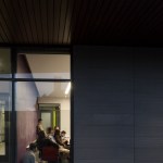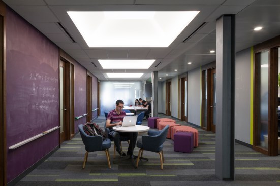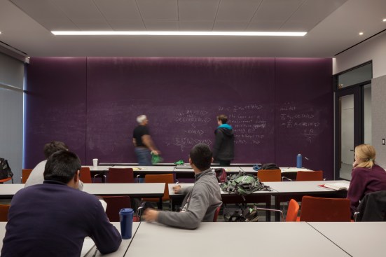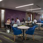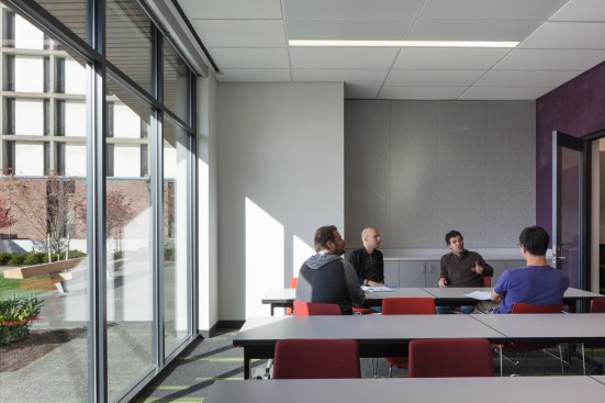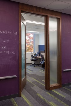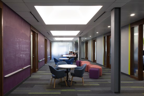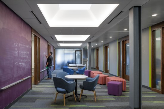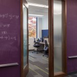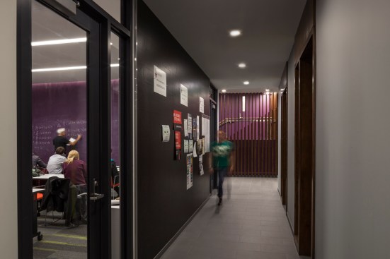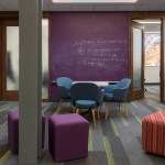 The three-story structure houses faculty, administrative, and student offices, meeting rooms, and flexible classrooms. The lobby connects campus to neighborhood, and large meeting rooms along the west edge open out to garden rooms. Informal collaborative spaces form the core of the upper floors, which are ringed by private and shared offices. Activated by brightly colored chalkboard paint walls, these spaces encourage impromptu interaction and facilitate a wide range of meeting types.