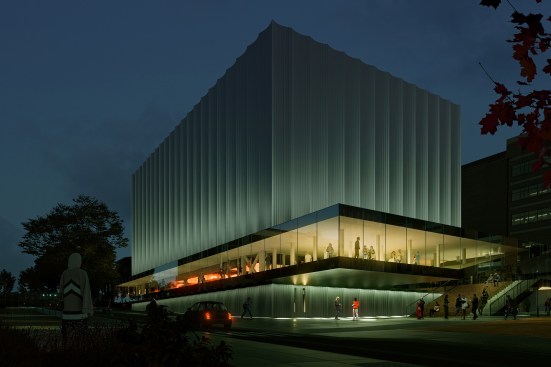Brown PAC’s main volume is shrink-wrapped in an extruded aluminum rainscreen, composed of a fractal-like fluted geometry. The multiple scales of the flutes, and their bas relief, is a subtle nod to Providence’s predominantly brick and wood-clad building stock, where flat glass or metal panel facades seem anathema.