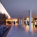 For Brown PAC to provide appropriate lobby space and engage its surroundings, the Clearstory is expanded on three of its four sides. On the east, facing the Perry & Marty Granoff Center for the Creative Arts, the Clearstory cantilevers 35 feet towards The Walk, forming a dramatic main lobby with views over campus. The cantilever protects the main entrance and its tribune, used for outdoor performances, student orientations, and other informal uses. On the south, the Clearstory extends 7 feet to form the Promenade, a passerelle to view the creation of art. On the west, the Clearstory cantilevers 14 feet to make an assembly area for performers prior to entering the main hall.