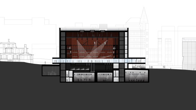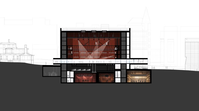 In addition to the main hall, the building contains three additional venues, including (shown left to right in the above section): a dance rehearsal room, doubling as a 110-seat informal dance performance space; a theater rehearsal, doubling as a 50-seat small performance space; and an orchestra rehearsal room, doubling as a 165-seat performance space for smaller ensembles. Each of these spaces has a pipe grid and connection points on the walls for lighting, audio, and video technology.