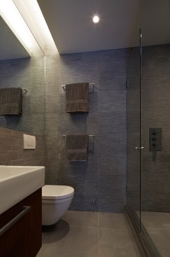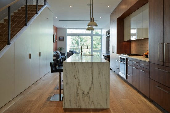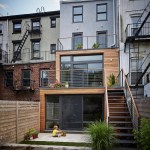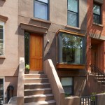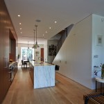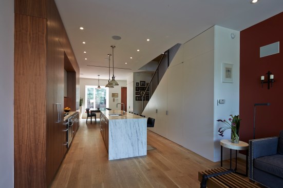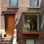 Sarah Jefferys Architecture + Interiors completed a two-story modern addition and gut renovation of the owner’s Brooklyn triplex. The aesthetic of the townhouse was achieved through a unique combination of modern design inserted within the rustic existing details, all of which were enhanced with sophisticated, high-end materials and the owner’s eclectic Asian art collection. A dramatic open stair serves as a striking design element, topped with a huge skylight that provides flowing natural light throughout the central well. A rich material palette of custom walnut cabinets, handsome marble countertops, and wide plank oak floors create a gorgeous home.