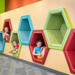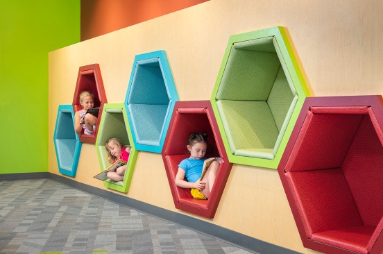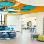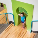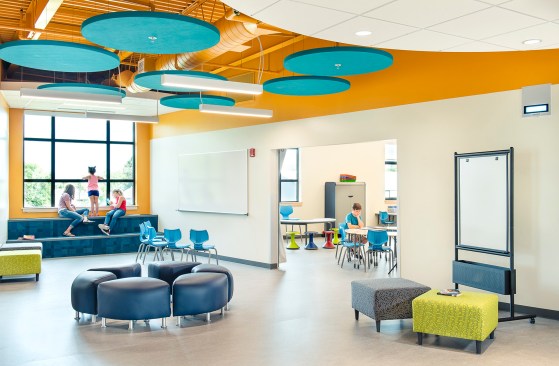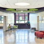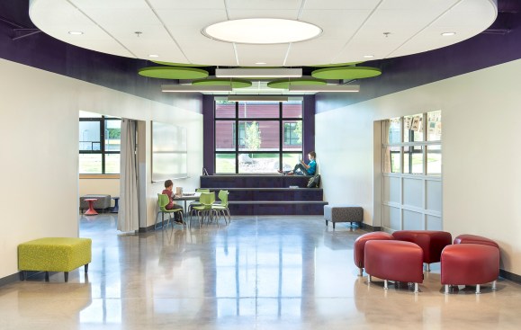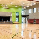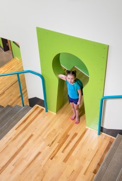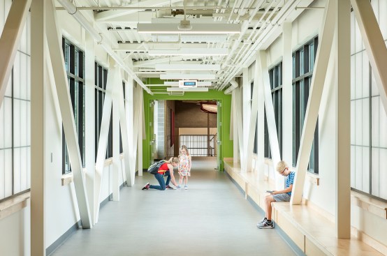 The spaces within the school are convertible with both overhanging doors and curtains that can separate learning areas for a variety of purposes, as well as movable furniture throughout. Stepped window seats add a unique element, perfect for reading, while cozy “honeycomb” seats provide an aspect of privacy and comfort for quiet times. The building’s signature sky bridge was devised as a practical solution to spanning the city’s primary water main, creating unique opportunities for seating areas within and for outdoor activities and green space beneath. The gym, stage, and music room are fully outfitted to serve not only student activities, but also community events.