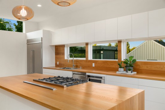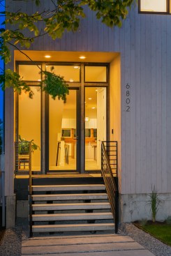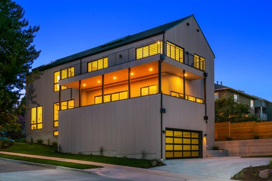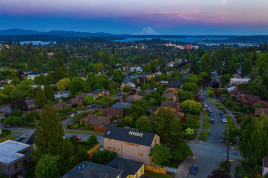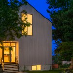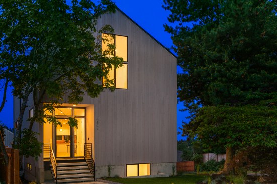 On a corner lot in the North Seattle neighborhood of Bryant, this single family home expresses a modern take on the farmhouse silhouette. The traditional gable roof is offset by a modern and minimal facade. The classic shape is intentionally utilized in a contemporary way. The house is capable of abundant natural light due to the vaulted ceilings, skylights and window placement. Those attributes combined with two wrap-around decks, create visual connections to Mt Rainier and Lake Washington.