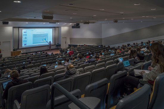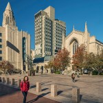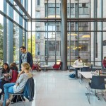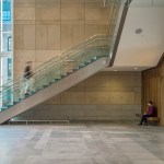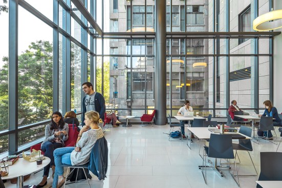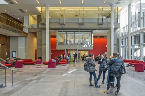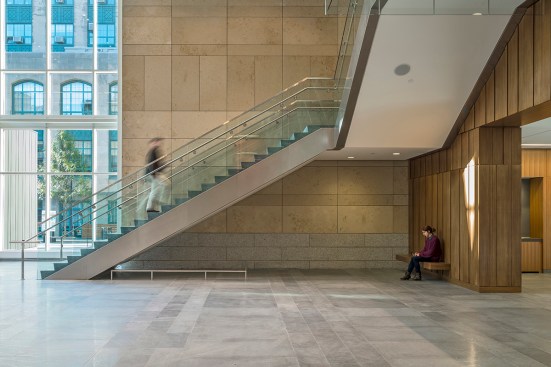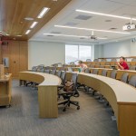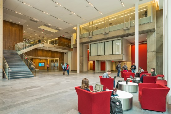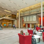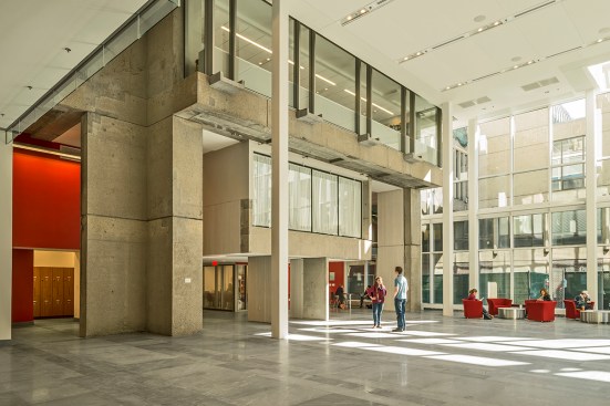 In addition to the external issues, the tower never worked well for its occupants. Its 18 stories were served by six small elevators that conveyed students to 100-seat classrooms on the upper floors. At peak times, it took as long as 20 minutes to go from one class to another. The gut renovation of the building’s interior included moving a majority of the larger classrooms to the adjacent Redstone Building, creating faculty and administration office space on the upper floors, and rehabilitating the Pappas Library with much-needed cosmetic and structural upgrades.