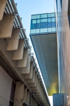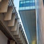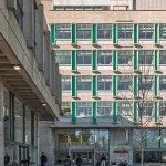 The materials, colors, and details of the Redstone Building complement Sert’s tower, the exterior of which was meticulously repaired and restored. Like many buildings of the era, the cast-in-place and exposed aggregate precast panels of the tower weathered poorly. Concrete spalled and steel frame windows and panels failed. The firm fully restored the building’s facade, repairing the concrete and replacing window and metal panels with modern, energy-efficient assemblies of similar design. Painted ventilator panels in Sert’s original bold colors have renewed the brilliance of his 1960 design.