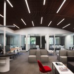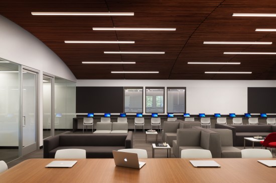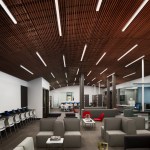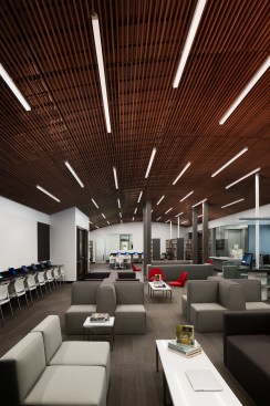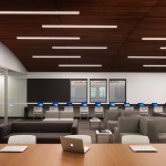 The library design focused on creating a distinctive main space within the limitations of the existing variable height shell. A vaulted wood grille ceiling was conceived and carefully positioned to maximize height while concealing all duct work and structure. Work tables and seating areas occupy the center and computer stations wrap the perimeter. The stack area occupies a quarter of the main space. Silent study rooms and the librarian’s office are located at the sides. Frameless glass was used to maintain an open feeling to these rooms as well as allow supervision of the students. The librarians utilize an information kiosk with a scanner, in lieu of a traditional circulation desk, to assist students and check out any of the hard copies. A central seating area was created within the main room, utilizing existing columns with added wood cladding, to define the space.