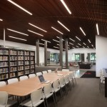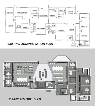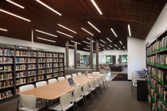 This project consisted of remodeling and re purposing the interior of an existing non-descript 2 story 1960s era building, into a modern high school library on the upper floor and classrooms below. The school administration requested the library be a comfortable sophisticated open working space that would foster interaction and use of technology. A limited existing floor size necessitated a smaller stack area reserved for hard copies of special volumes with an extensive selection of books moved to digital format.
